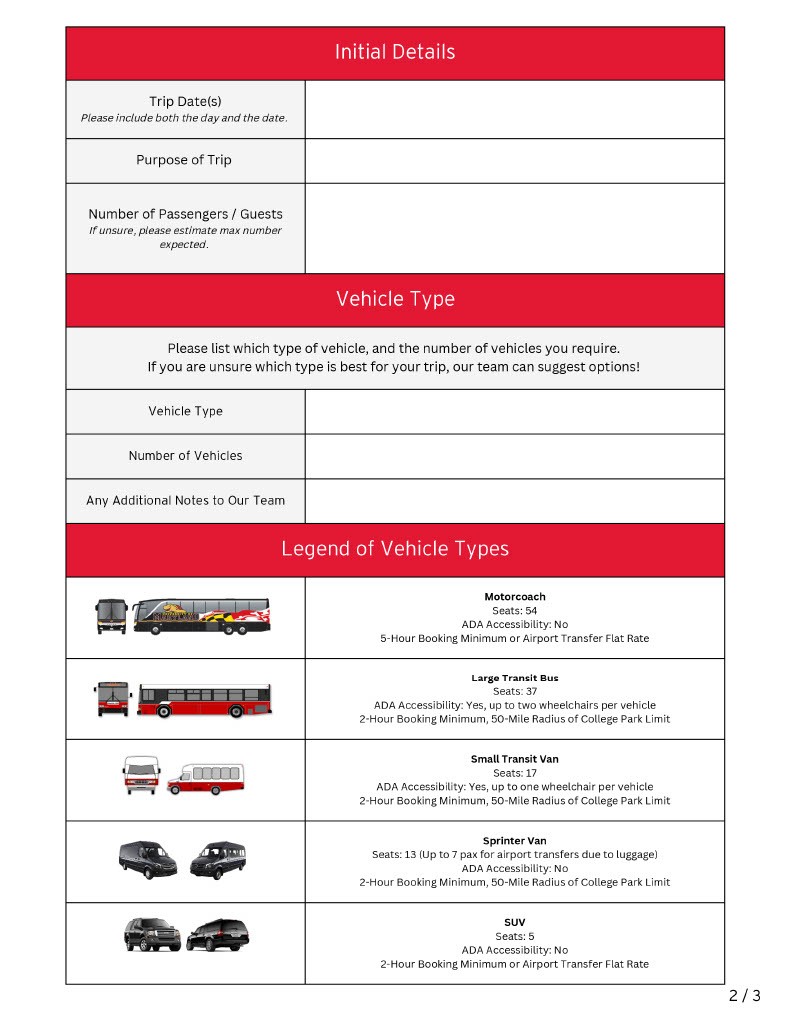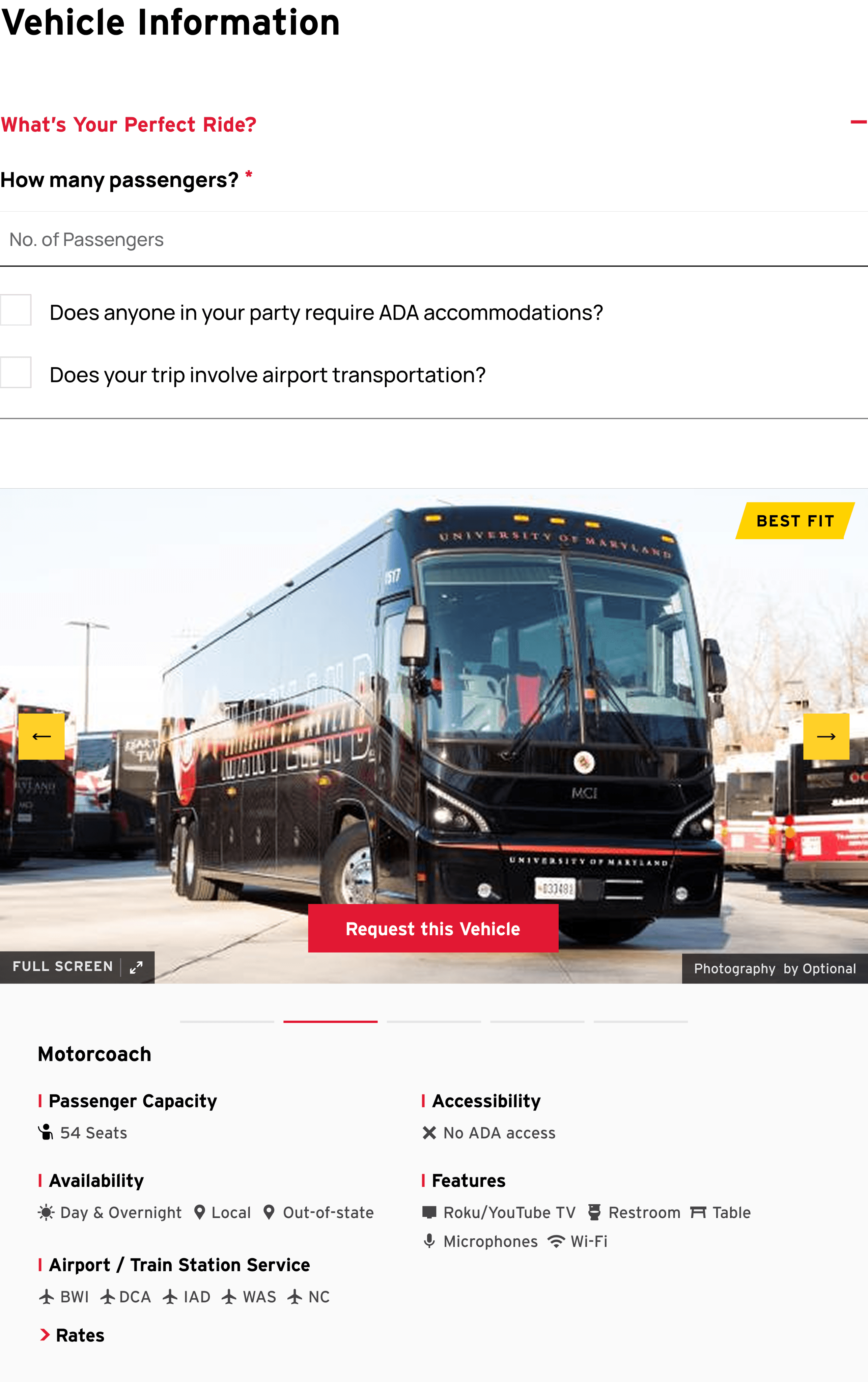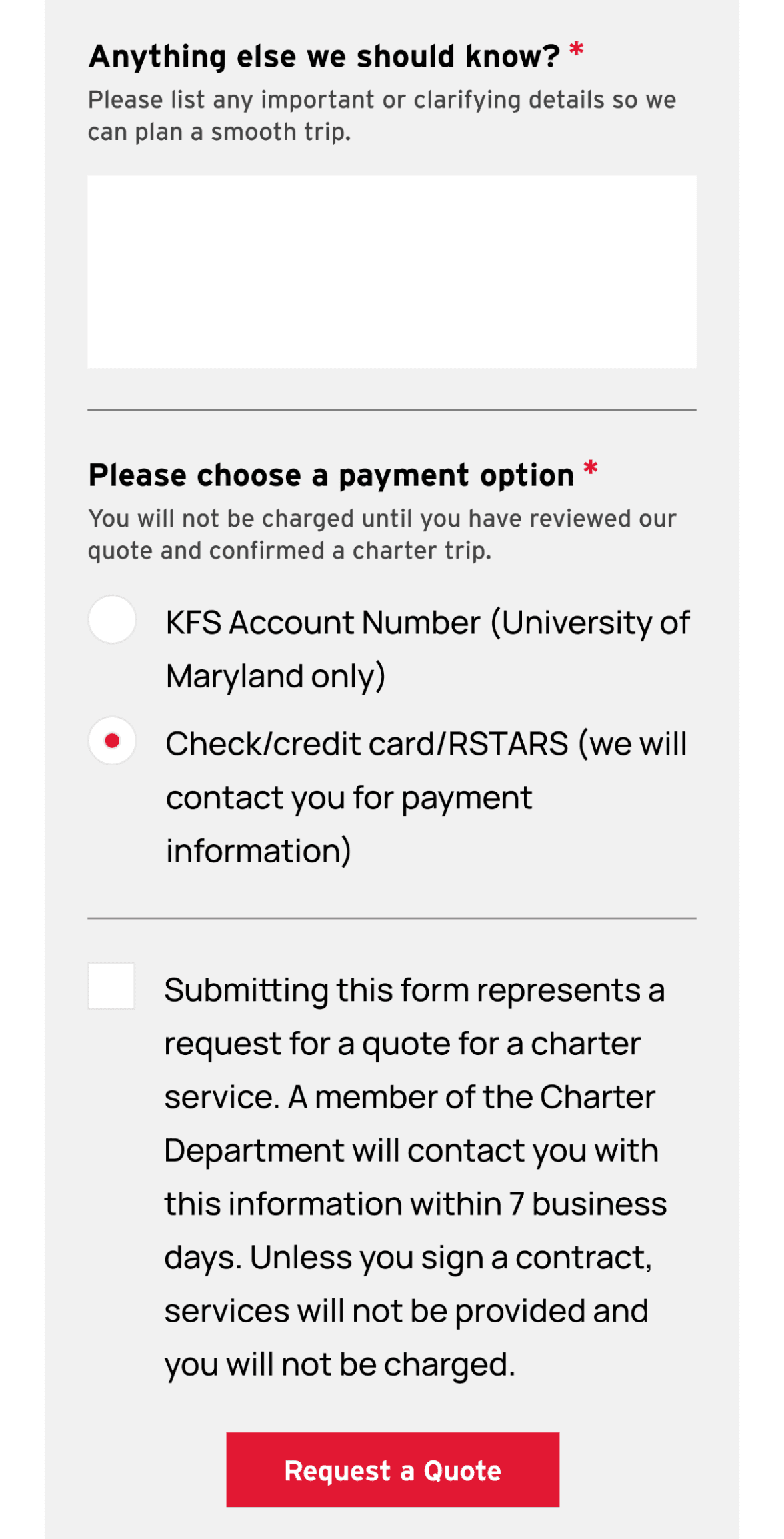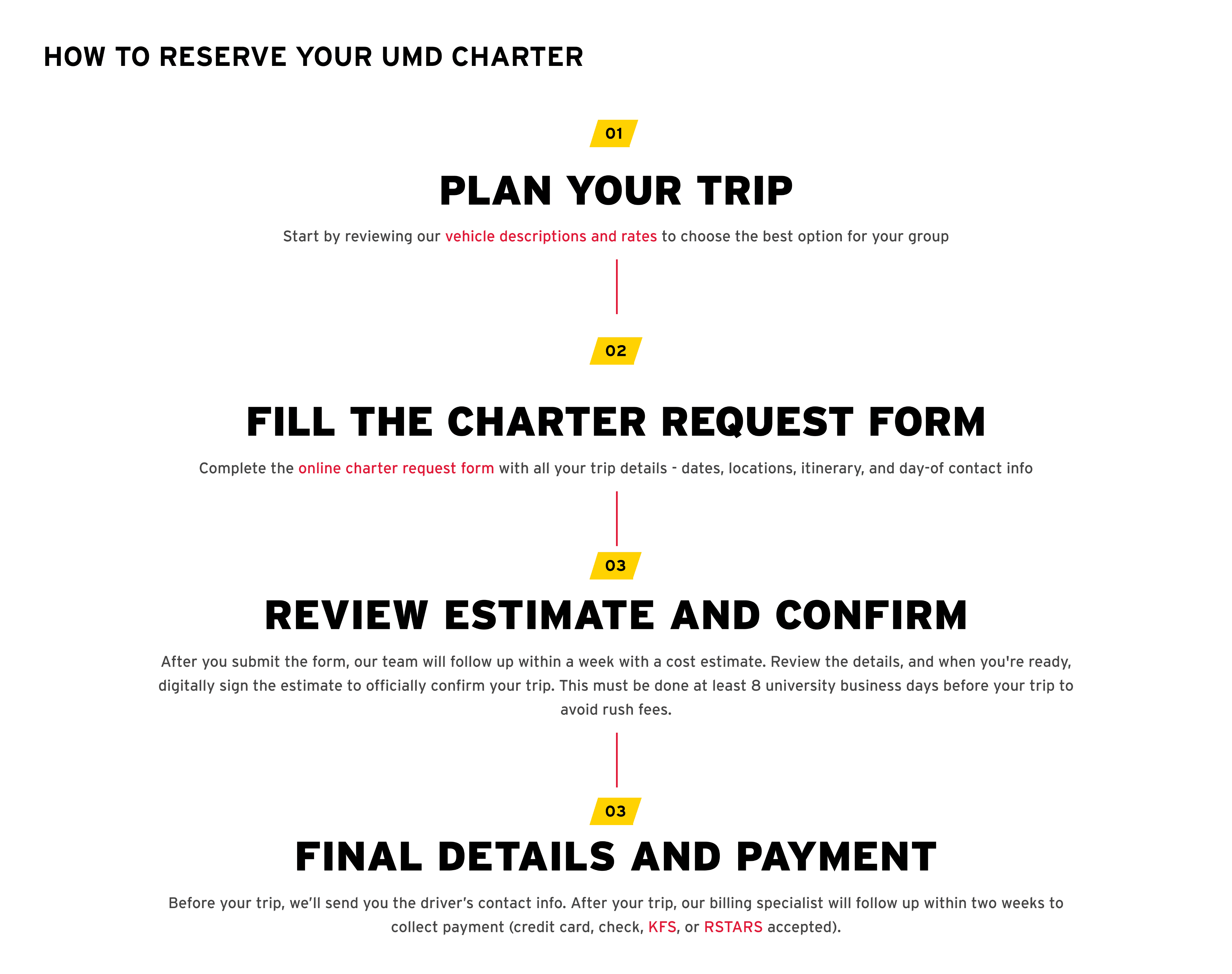 UMD’s charter service allows faculty, staff, and coaches to request transportation for classes, events, and athletic travel. The existing experience relied on a dense web form and scattered information, creating confusion, errors, and frequent dependency on staff support. This redesign focused on improving clarity, streamlining the request process, and enabling users to complete submissions independently.