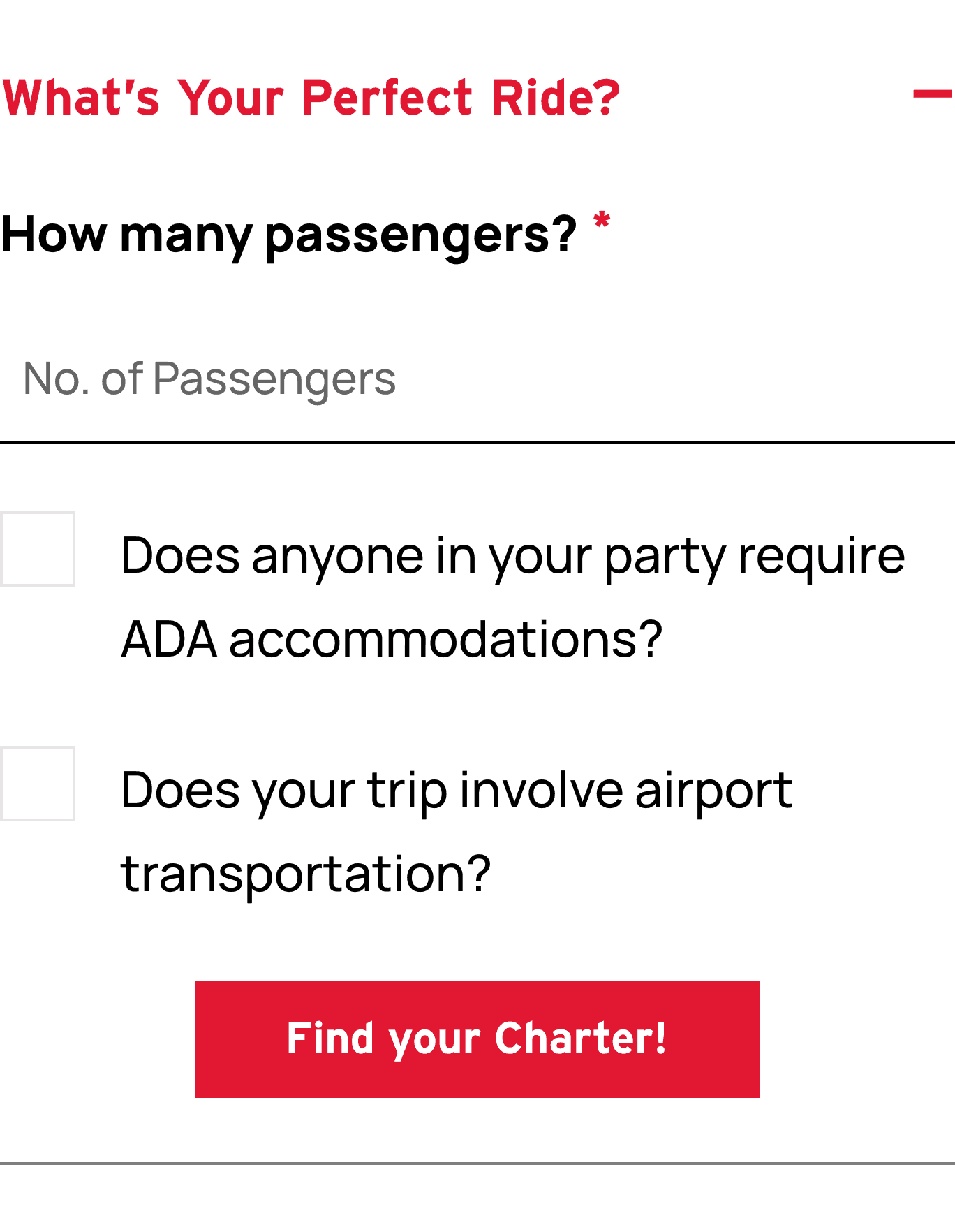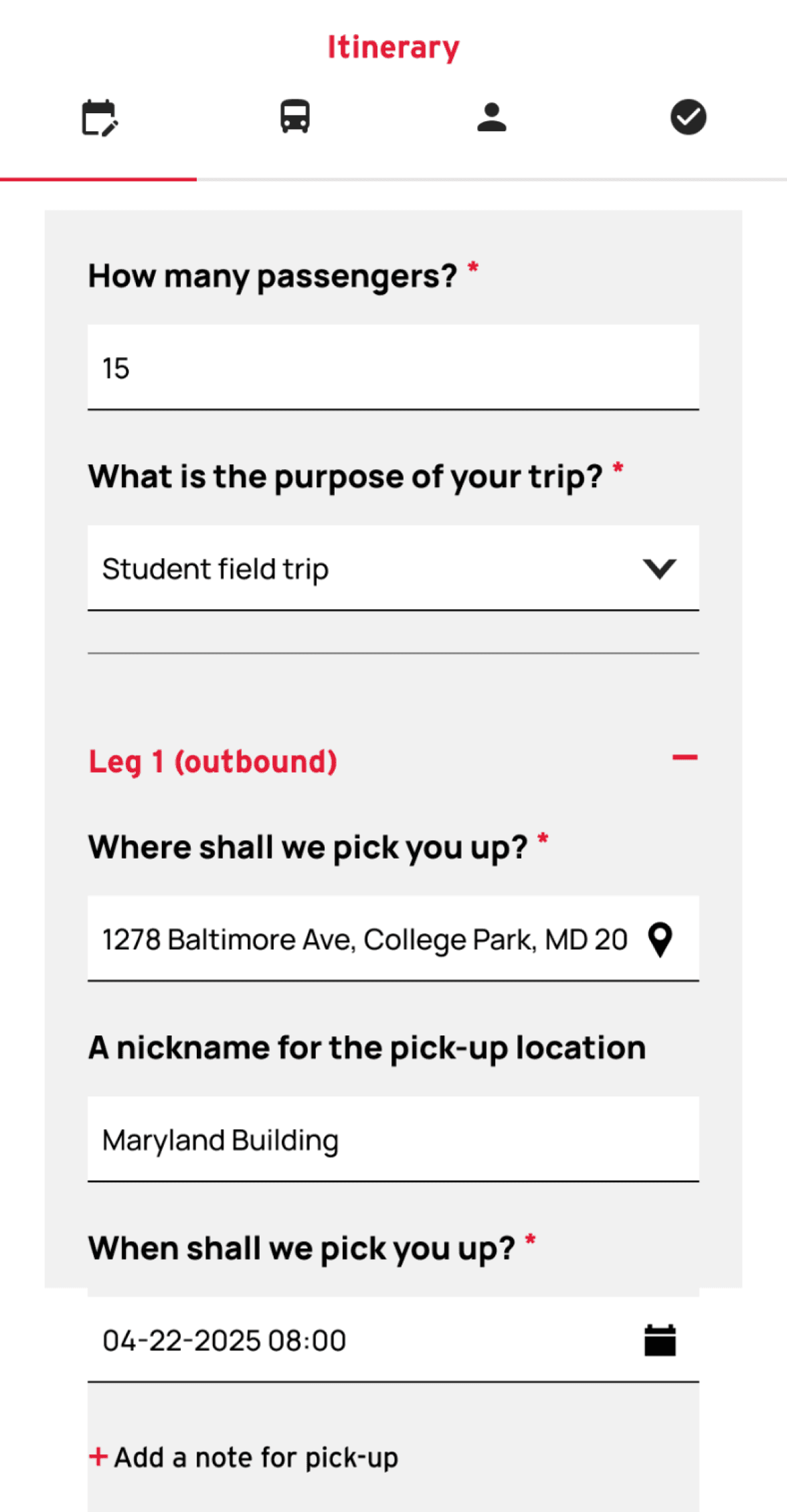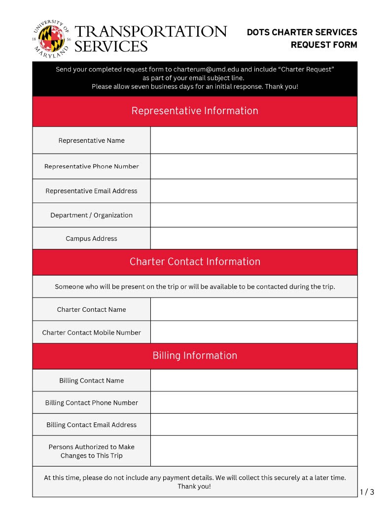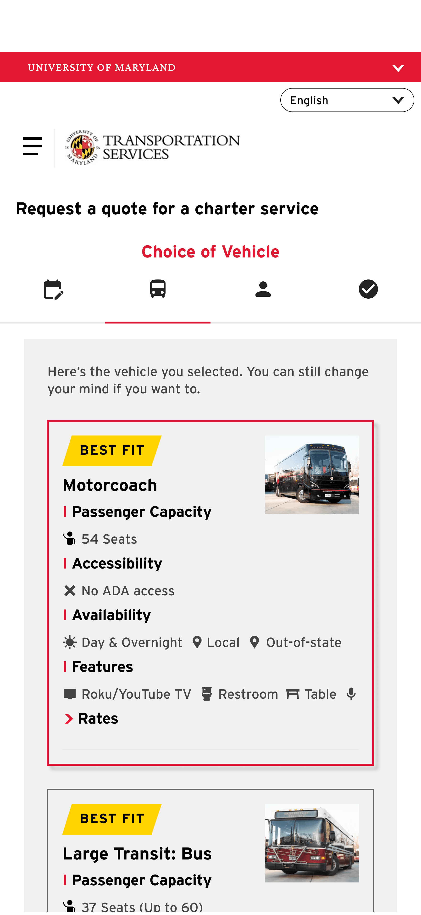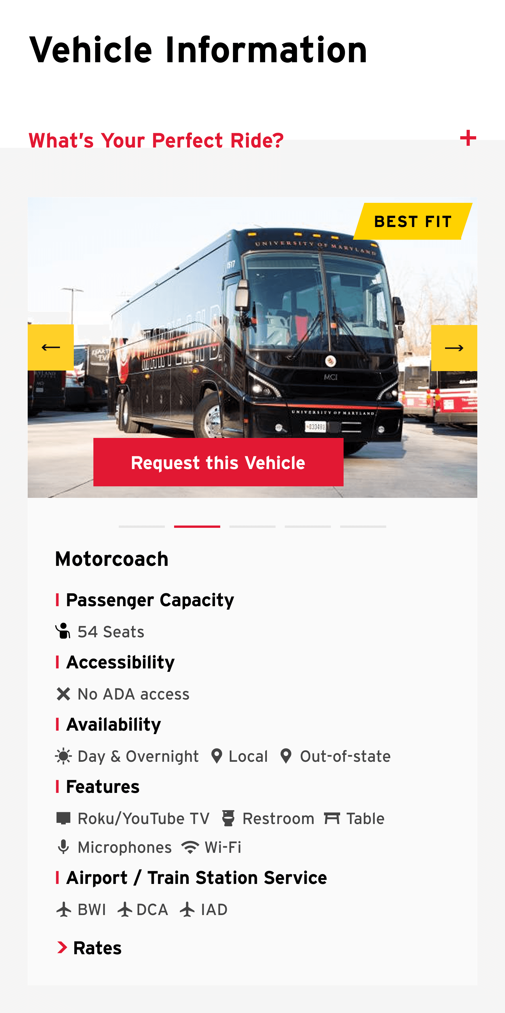 UMD’s charter service allows faculty, staff, and coaches to request transportation for classes, events, and athletic travel. The existing experience relied on a dense web form and scattered information, creating confusion, errors, and frequent dependency on staff support. This redesign focused on improving clarity, streamlining the request process, and enabling users to complete submissions independently.