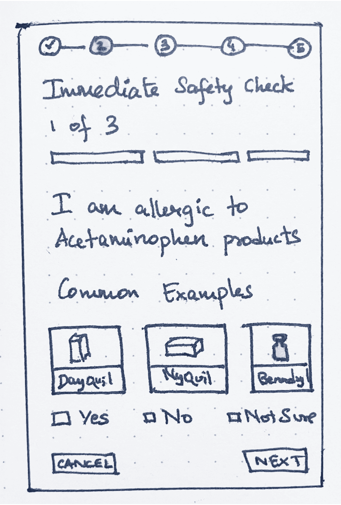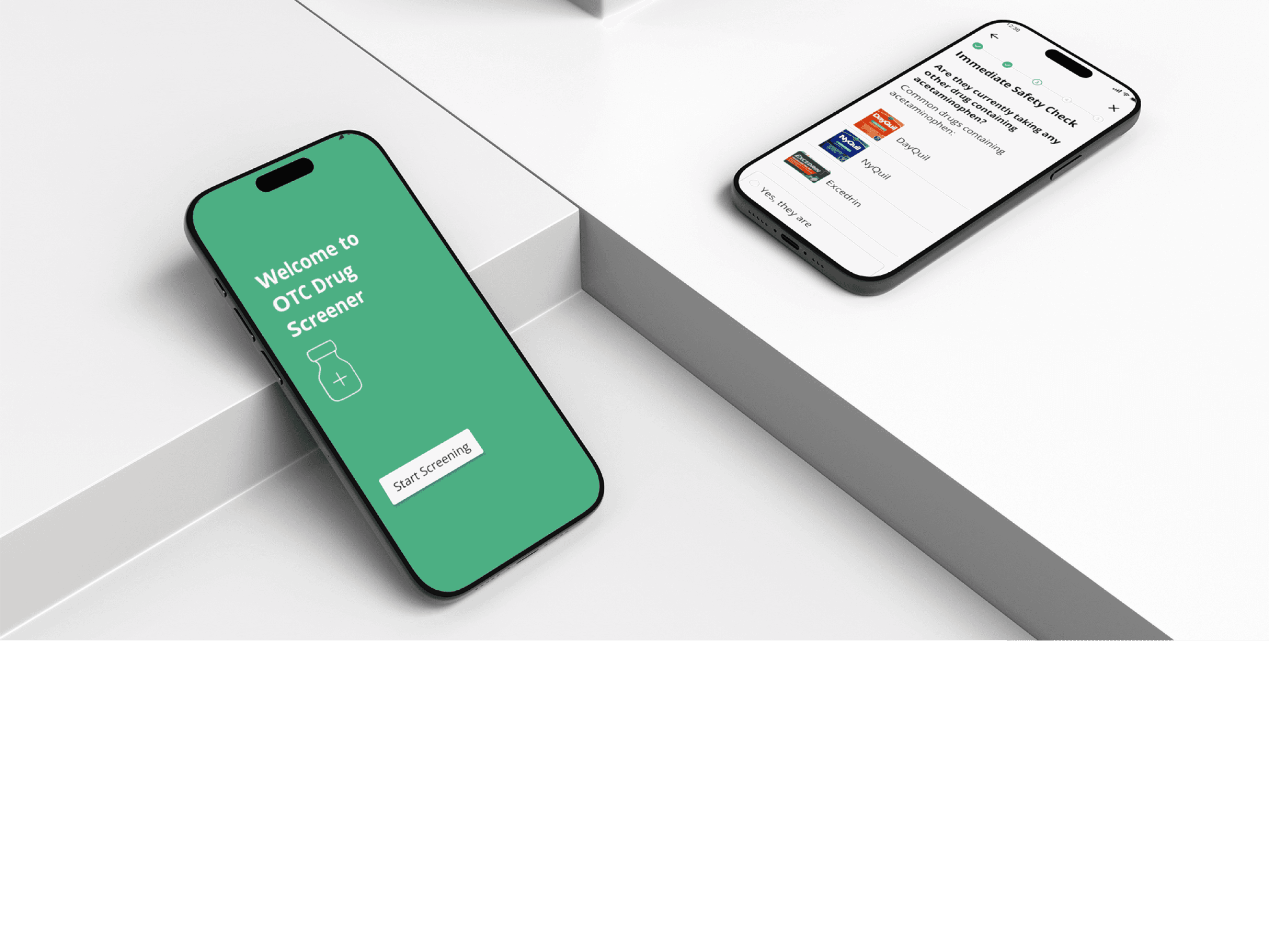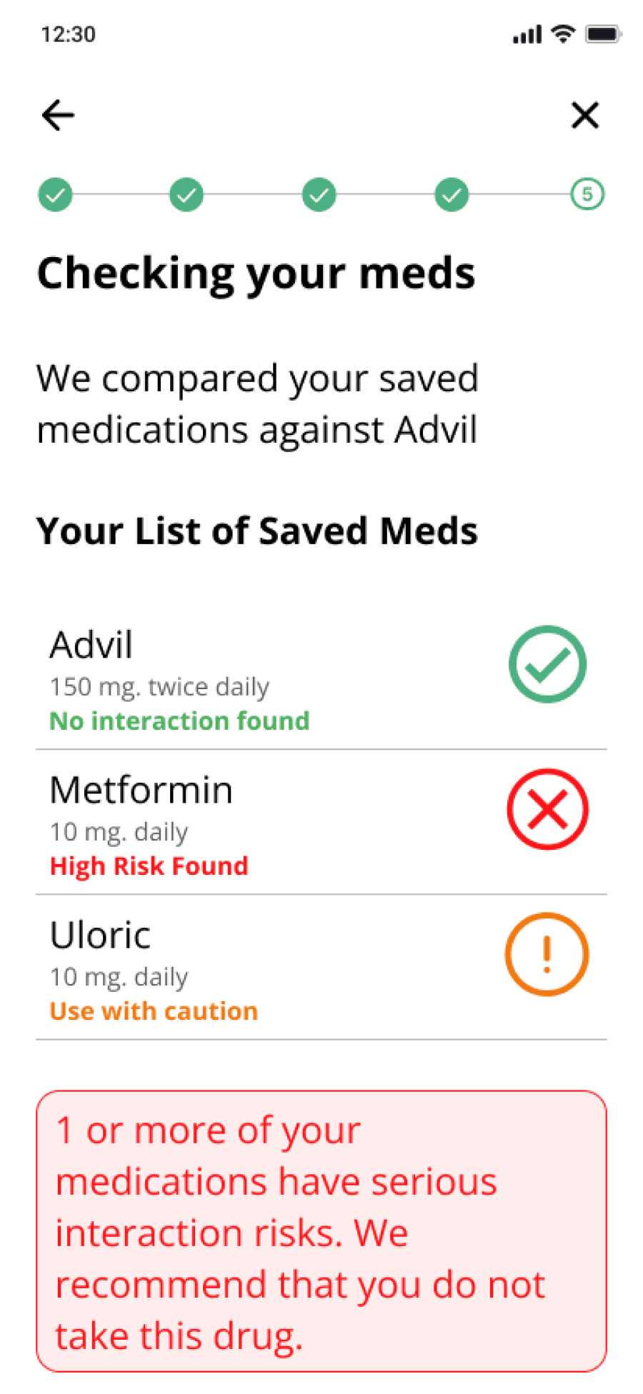 The core design challenge was to take every element of the FDA Drug Facts label and convert it into something a 70-year-old managing multiple chronic conditions could navigate confidently without removing a single data point. The label's content maps to three possible outcomes for any user: safe to take, consult a doctor first, or do not take. That structure became the spine of the questionnaire.