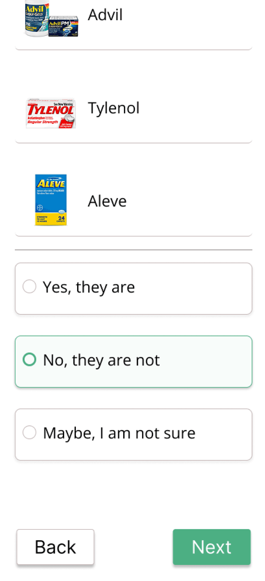 The FDA Drug Facts label presents drug interactions as static warnings, which initially translated into directly asking users about specific contraindications (for example, “Are you taking Drug A?”). While this approach aligned closely with the label, it assumed accurate recall of medication names which is a challenge for older adults managing multiple prescriptions.