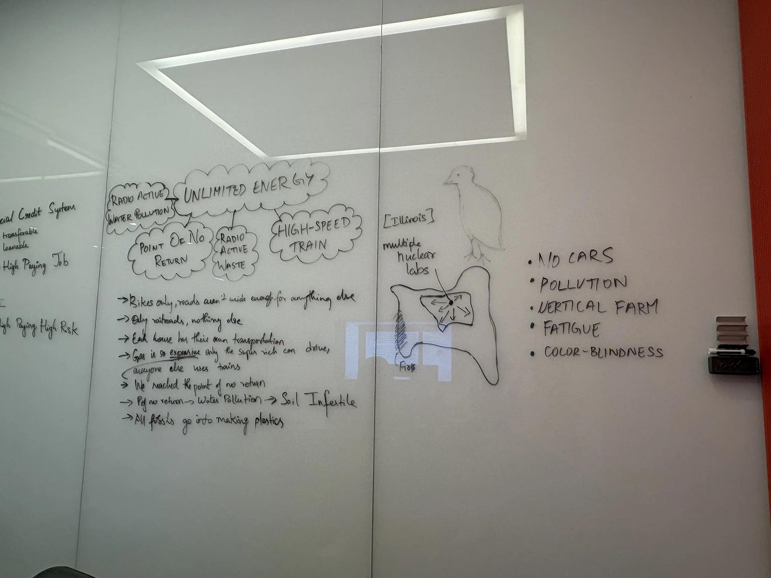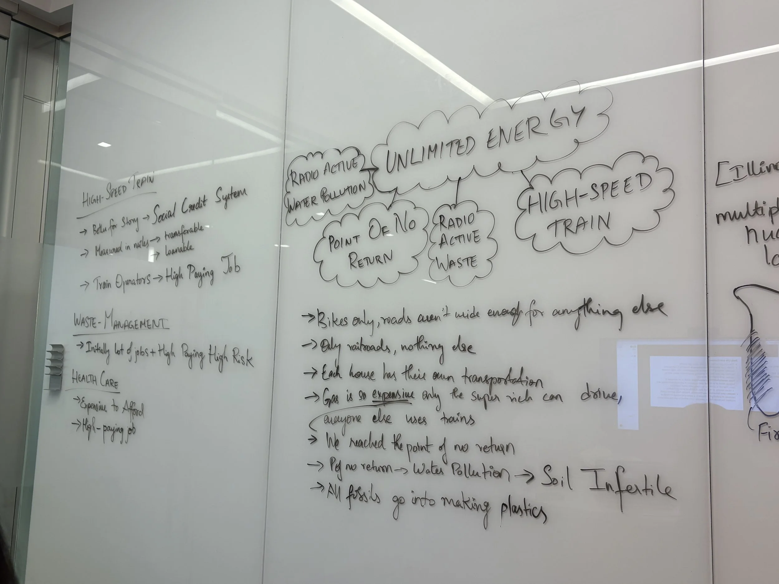 The team collectively used the cone of possibility to speculate future scenarios focusing on energy and pollution. We then solidified the realities of our speculative world each of our apps would be developed for and marked it on the cone of possibility. Shown to the side are the notes from our brainstorming sessions to speculate scenarios and narrow down details of the world to be designed for.