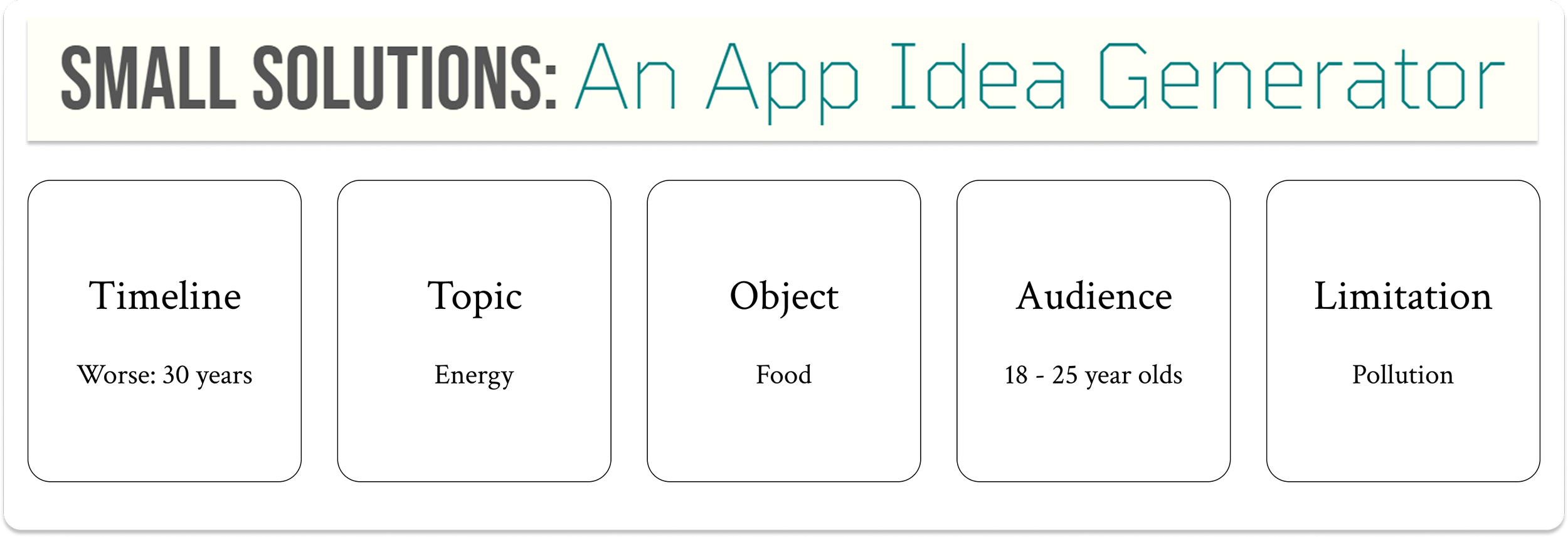 Each team member used this generator to generate an app idea encompassing the parameters. All five topics were then consolidated to then guide scenario planning.